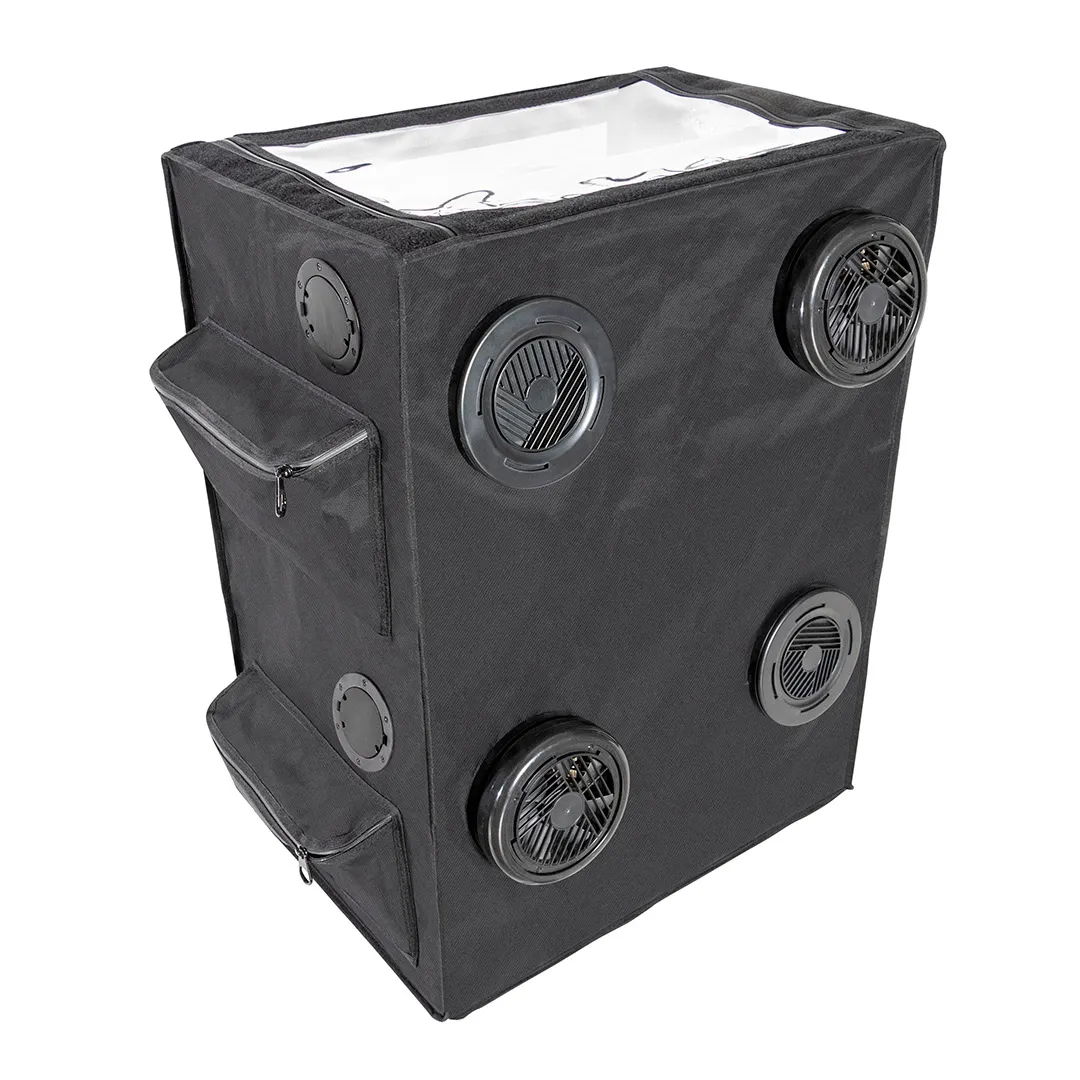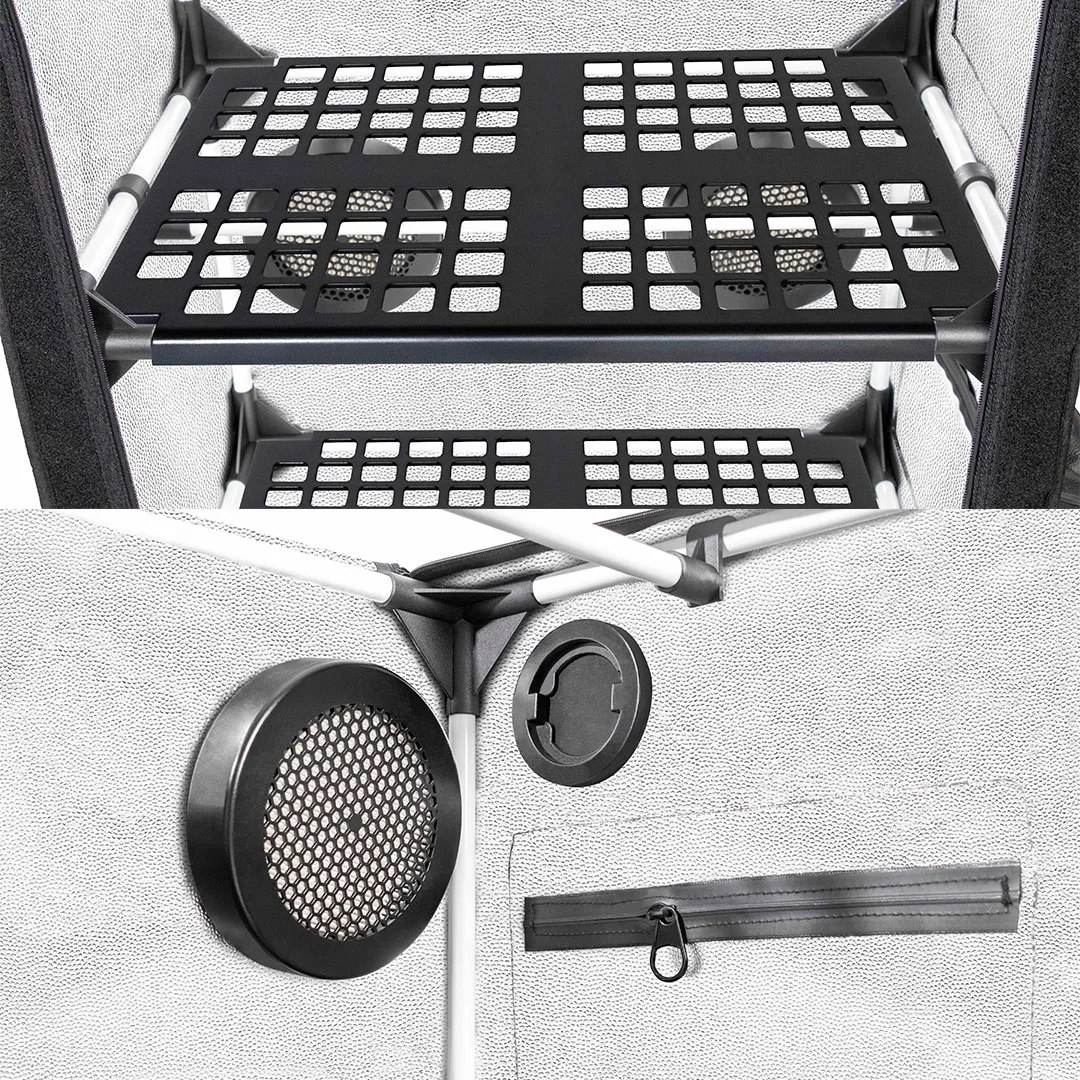 Uno de los puntos destacables de este armario es su excelente gestión del clima interno, fundamental para la micología. El Garden High Pro está equipado con entradas y salidas de aire estratégicamente situadas que permiten instalar sistemas de ventilación, filtración o humidificación según las necesidades de cada especie de seta. De esta manera, el usuario puede controlar parámetros clave como la humedad, la temperatura y el nivel de oxígeno, asegurando un ambiente estable que favorece la fructificación.