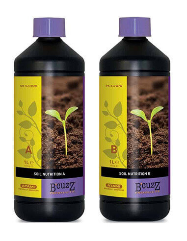B’Cuzz Tierra A+B de Atami es un fertilizante base en dos componentes diseñado específicamente para cultivos en sustrato de tierra. Su fórmula profesional proporciona todos los macronutrientes (NPK) y micronutrientes esenciales que las plantas necesitan durante todo el ciclo, tanto en crecimiento como en floración.