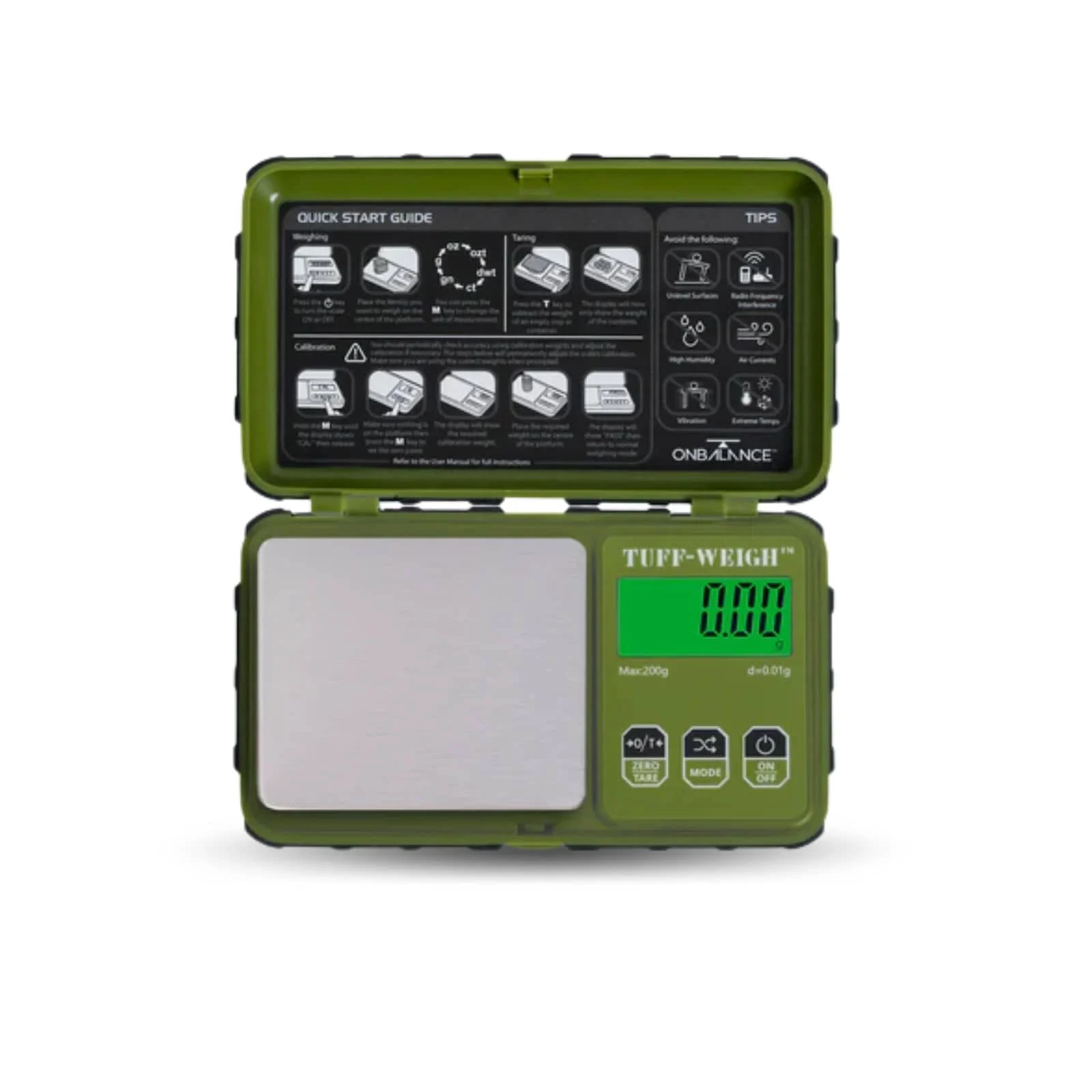 Báscula On Balance Tuff Weigh es una balanza digital de gran precisión (200 gr x 0.01 gr), de alta resistencia y fiabilidad y con una larga vida útil. Contiene una plataforma resistente de acero inoxidable, además de una una gran pantalla LCD y una tapa resistente para cerrarla y tenerla protegida.