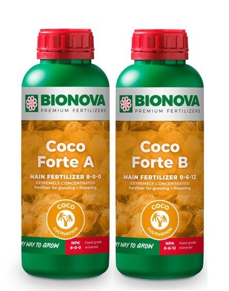 Coco Forte A+B de Bionova es un fertilizante de coco extremadamente concentrado. Una solución nutritiva con oligoelementos quelatados para ser absorbidos. Con una concentración de 1: 600 NPK A 8-0-0 B 0-6-12. Este fertilizante está diseñado para las fases de crecimiento y floración de tus plantas.