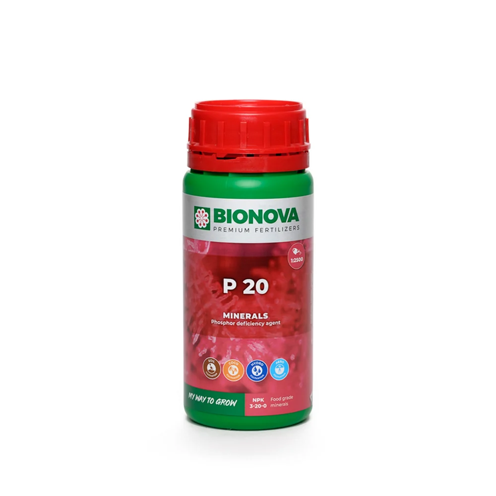 P 20 Fósforo de Bionova es un producto especialmente indicado para las deficiencias de fósforo. Este producto con una concentración del 20% en fósforo, 1: 2500 – NPK 3-20-0, es utilizado además como estimulador de las raíces y de la floración en las plantas.