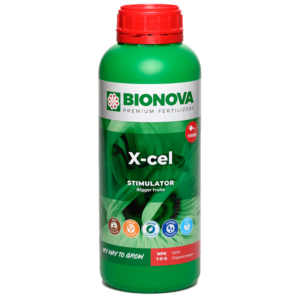 X-ceL de Bionova, una fórmula de componentes que funciona como estimulador de flores y crecimiento. Consigue mayor calidad y rendimiento en cualquier tipo de planta. Aumenta la cantidad de flores y frutos, además del tamaño de la planta.