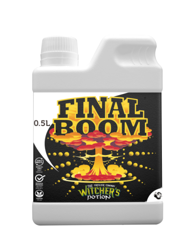 Cannaboom Final Boom es uno de los nuevos aditivos de la línea de abonos barata The Witcher’s Potion de este fabricante. Se trata de un finalizador y compactador mineral de resultados impactantes. Su uso en las 3 últimas semanas de floración, hará que las flores tengan más dureza, más volumen y más peso.