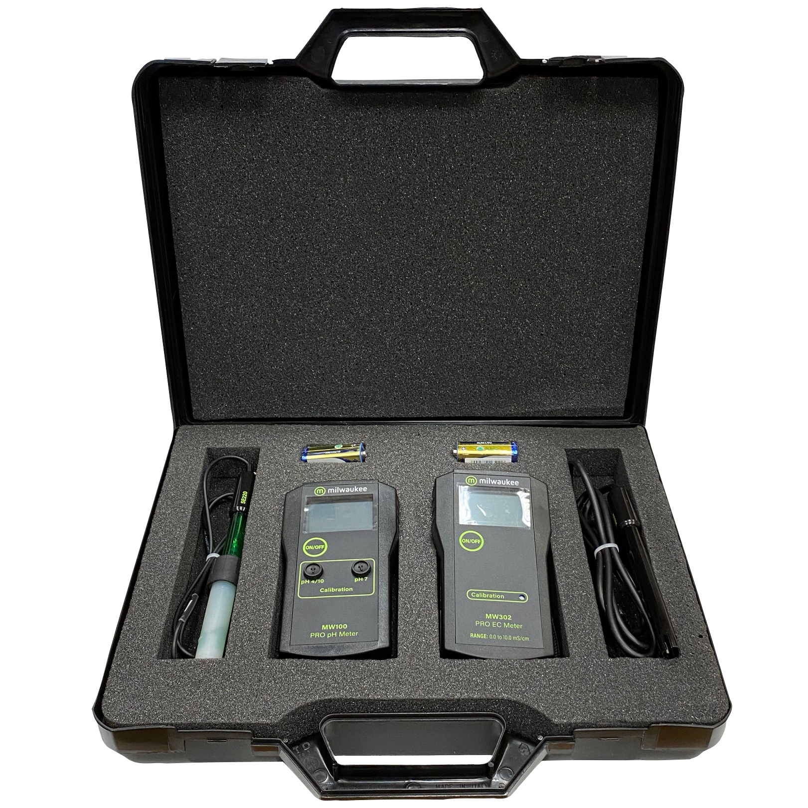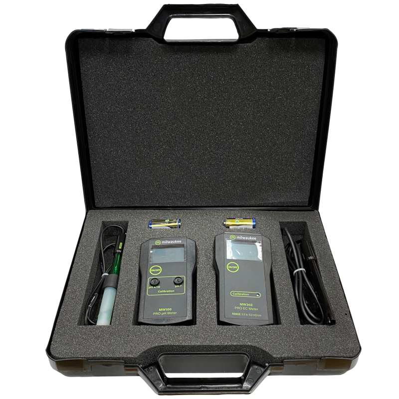 El maletín PH y EC Clásico es un maletín de protección y transporte de los medidores MW100 (medidor de PH) y MW302 (Medidor de EC). Además de los medidores, vienen sobres de calibración de ambos medidores de PH y EC, así como instrucciones en 2 idiomas, pilas 9V.