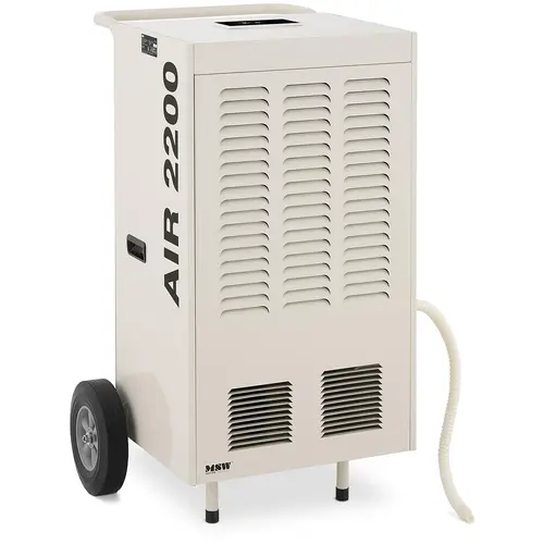El secador para construcción extrae del aire hasta 158 L de humedad al día, que de otra forma se asentaría en las paredes. A este fin, hace que circule hasta 1.100 m3 /h y lo enfría por medio de su potente compresor equipado con 1.650 W. El líquido condensado se recoge en el dispositivo y se descarga a través de una manguera. El deshumidificador es perfecto para habitaciones de hasta 120 m2.