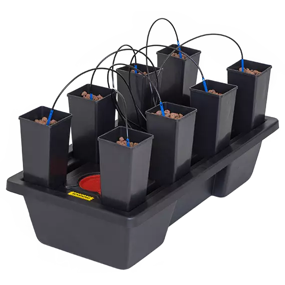 El sistema hidropónico Wilma Small Wide 8 11L es un gran sistema de cultivo para cultivadores nuevos y experimentados. Todos los sistemas Wilma se pueden montar en minutos. Solo tienes que colocar el depósito en el lugar correcto de tu cuarto de cultivo, poner las bandejas superiores sobre el depósito y luego colocar las macetas sobre él. Instale la bomba y las tuberías de distribución. Llene las macetas con el sustrato (tierra, coco, lana de roca, guijarros de arcilla). Lleve las líneas de goteo desde la tubería a cada maceta. Conecte el gotero correcto para el sustrato que está utilizando (utilice los goteros de inundación para los guijarros de arcilla y utilice los goteros de flecha para los sustratos con mayor retención de agua – tierra, coco, lana de roca).