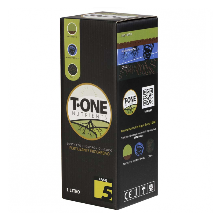 T-One Nutrients Fase 5 es un fertilizante diseñado para aportar todos nutrientes que necesitan nuestras plantas durante la etapa de floración y así garantizar una correcta formación de flores y frutos sin ningún tipo de carencia, garantizando la máxima producción y calidad.